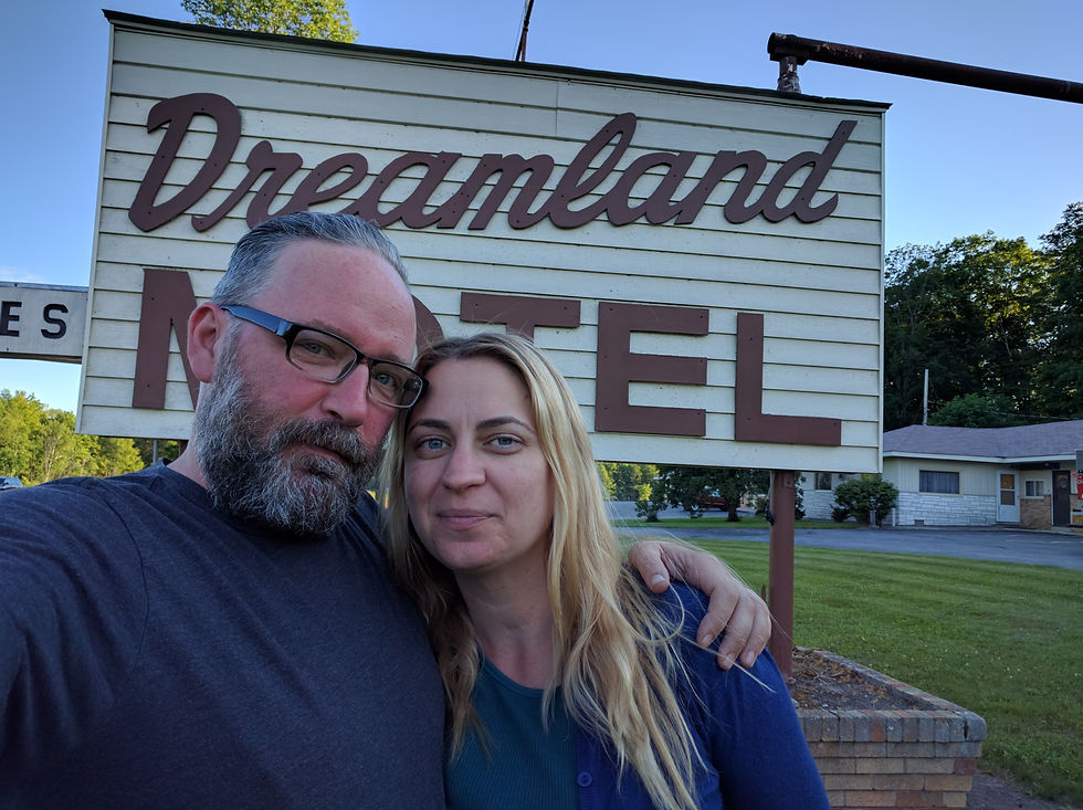 Jason's very kind family waves farewell as we hit the road. It's noon. Hungry, we stop on the way out of town for lunch, digging into two large and tasty pulled pork sandwiches. Today we're sticking to backroads, traveling up the northwestern coast of Michigan, crossing the Mackinac Bridge to the Upper Peninsula. Our destination for the evening is Gulliver, home of the Dreamland Motel.