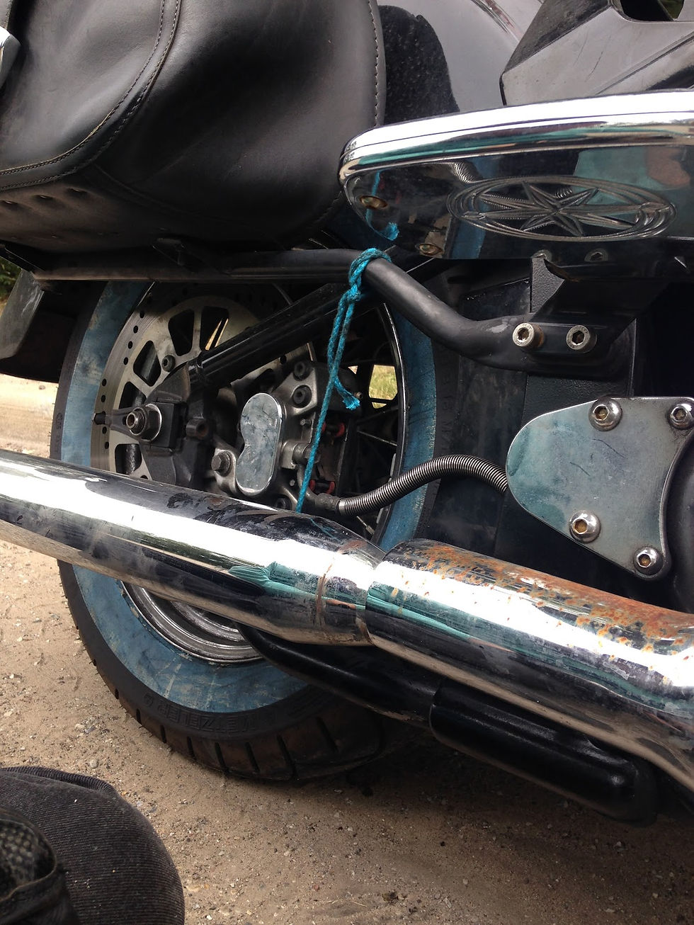 In the end, he doesn't have the locked bolts the bike needs, so he welds his own. The bracket is back in place, and we are safe to ride on. The owner charges us a ridiculously minimal fee, Jason hands him the thank-you cookie he got for him at the bakery, and we are back on the road with only an hour lost to the whole ordeal. Jason keeps the hoodie string as a reminder.