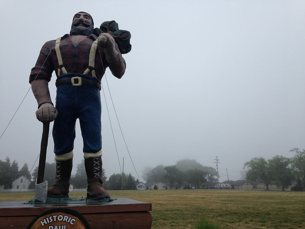 As we head due south along the cost, we drive into a dense fog that hugs the shoreline. At first it looks like smoke, but there is no smoke smell, and the air feels impossibly cool and damp. Ninety minutes south of Presque Isle, we stop to stretch our legs in Oscoda, in front of a giant Paul Bunyan statue, standing tall above the town, his head disappearing into the haze.